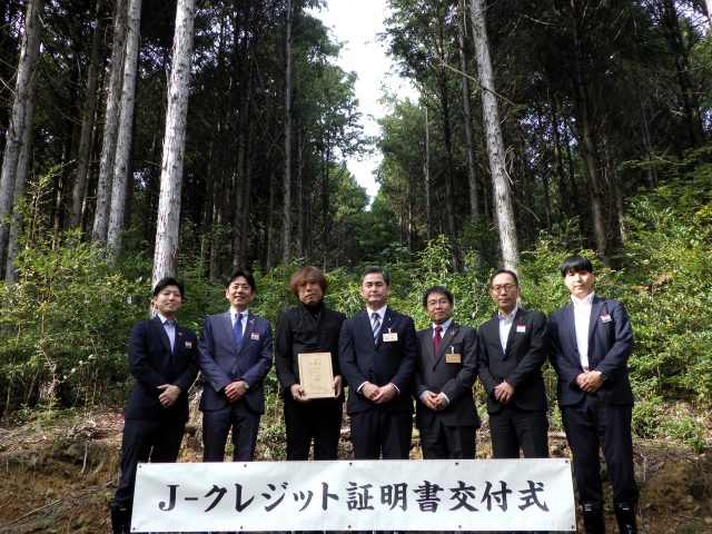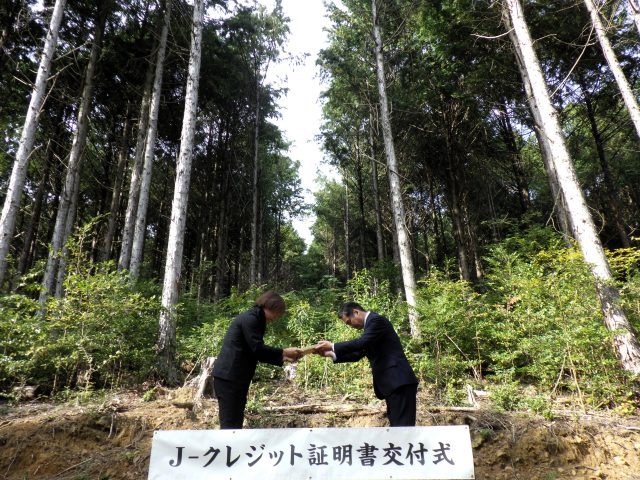 これまでは室内で交付式を開催しておりましたが、今回初めて公社造林地で「J-クレジット証明書交付式」を開催いたしました。