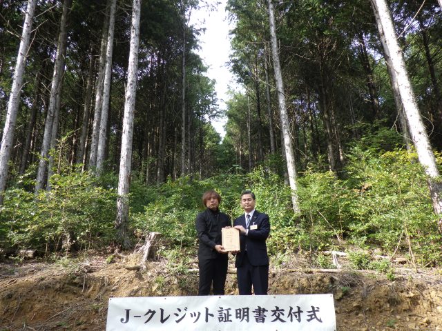 令和7年11月4日に津山市内の公社造林地において、公社J-クレジットをご購入いただいた株式会社ONE様に対して木製証明書を贈呈いたしました。